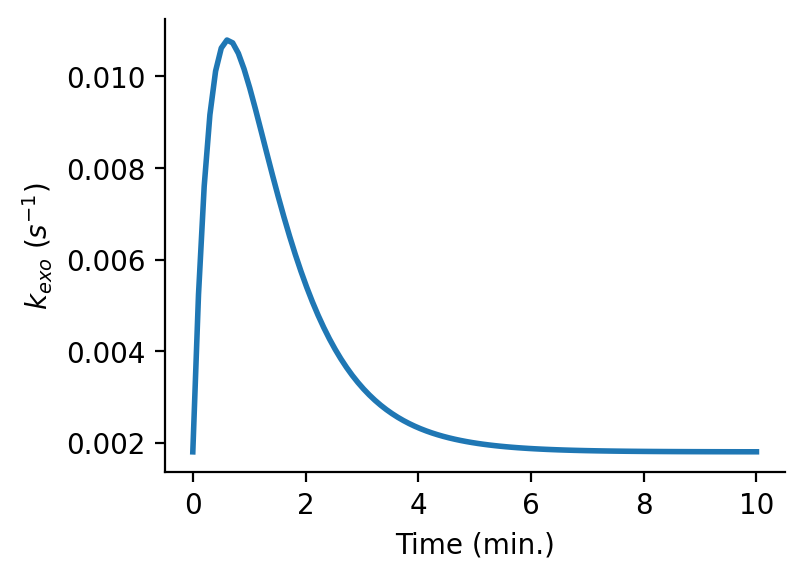 >>> plt.figure(figsize=(4,3), dpi=150) >>> plt.plot(t/60,kexo0*rm.Stim_Resp(t,1,5,25,60), linewidth=2) >>> plt.xlabel('Time (min.)') >>> plt.ylabel('$k_{exo}$ ($s^{-1}$)') >>> sns.despine()